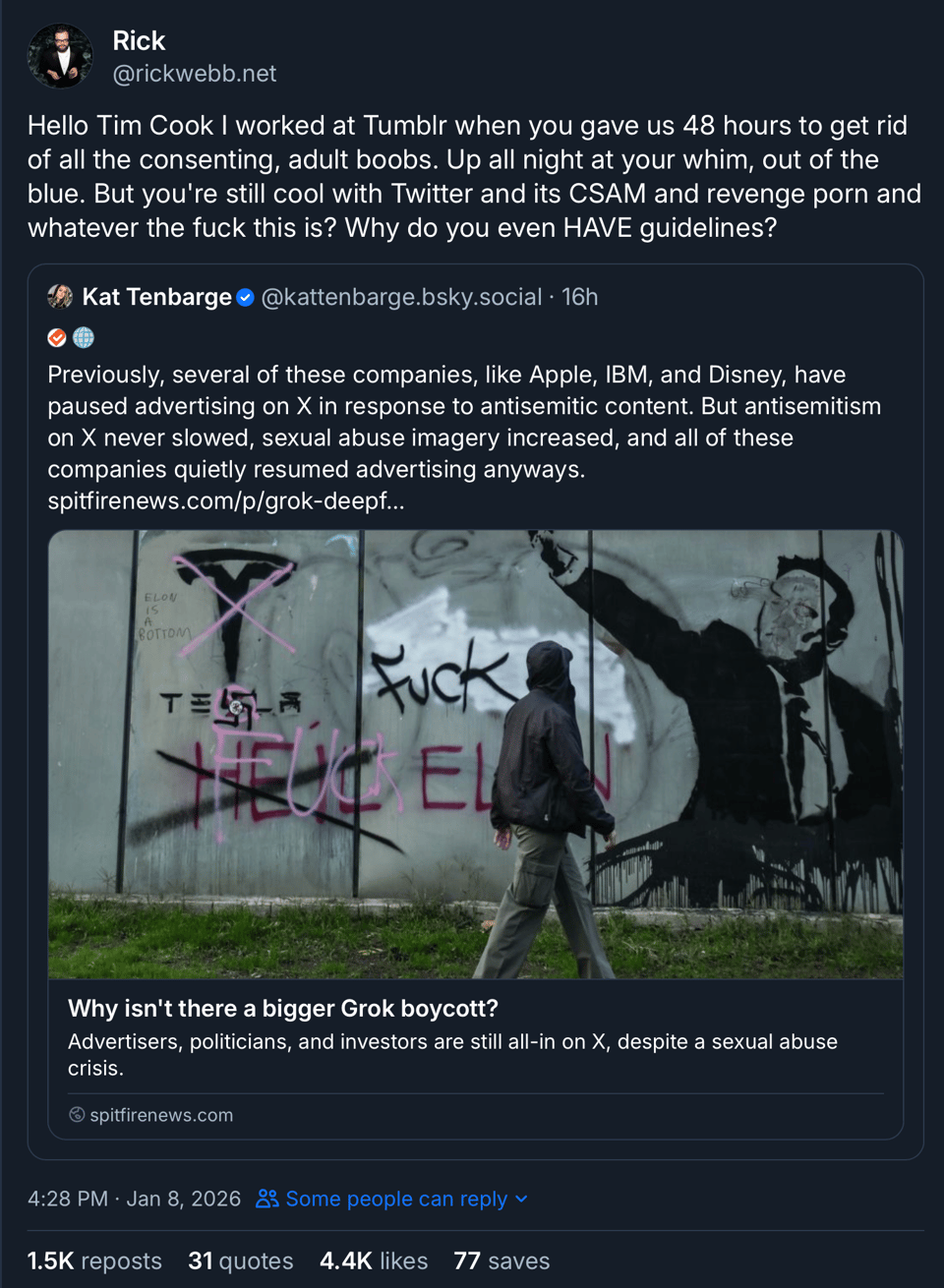 Speaking of the socials I am, as we speak, experiencing a viral skeettweet. It is not too unpleasant — one thing Bluesky does well is let you limit who can reply to you, so the whole thing isn’t making my life miserable. Just stressing me out that it might make my life miserable. I have really begun to take for granted my hard-earned internet obscurity of the 2020’s, as opposed to the 2010’s. And I assumed that this insightful Tweet, like all the others, would disappear into the ether. But nope, it got picked up. Which, ostensibly, if you read it, is the goal, but still. Largest viral tweet of mine since the Twitter days, maybe 12, 15 years. Four thousand likes, a thousand retweets. Terrifying.