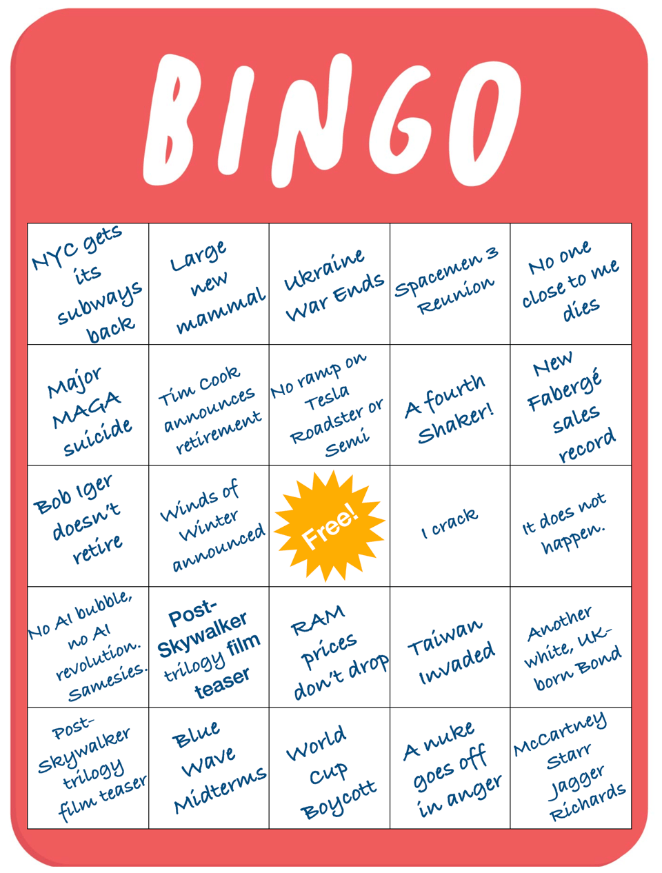 2026 Bingo card. Inspired by Hank Green and others, I made a Bingo card of my predictions for 2026. And we really are getting on in the year and it would be absurdist if one of my predictions came true before I even published the bingo card so here it is. Apologies for some of the dire predictions, trigger warning, etc. etc. Though some are fun. I tried.