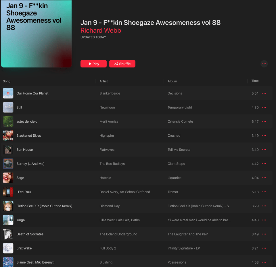 All right. Shoegaze playlist for you, all new bands. I love them all. Shoegaze rules right now. Oh wait I lied one old Boo Radleys song, thank you Pitchfork for the reminder of that album. Flatwaves, you will recall, ranked #1 on my 2026 list to you might want to check them out.