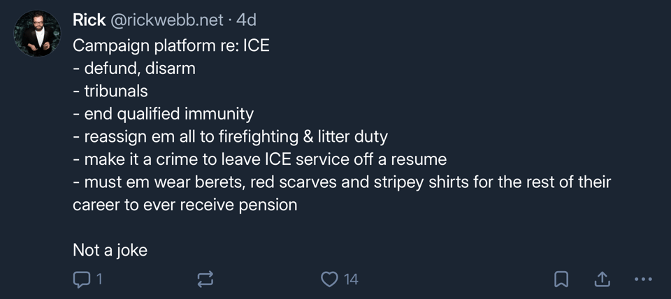 Wow just started right in there. Well, what are you gonna do. I wonder what its like to be someone who doesn’t pay attention to politics. I wonder what it’s like to be someone who thinks this is all same as it ever was. I mean, to some extent, that’s true. To some extent, this is a return to form. I mean how much national coverage did the NYC Draft Riots or the Pullman Strike massacre get back in the day? Republicans have done a great job muddying the media waters, taking us back to a time where the government can, you know, invade Panama without the populace knowing. Not quite completely there, but boy howdy, nothing like, say, 2000.