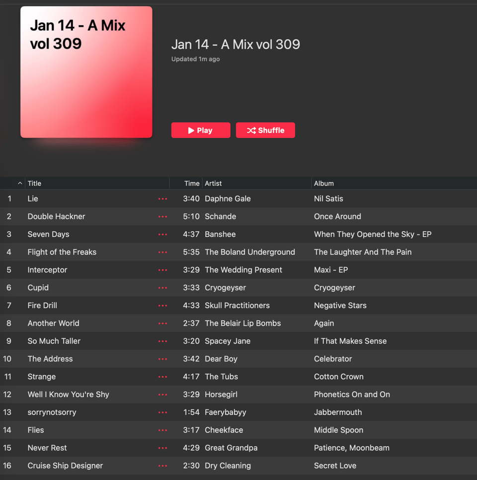 Anyway we’re finally almost done with the two days of music we had in our “To Investigate” playlist on January 1st, from all of the best-of-the-year lists. I finally got to listen to the new Dry Cleaning album yesterday and it is as good as everyone says I liked it a lot. I need to listen to it on headphones will on a walk to take in all the lyrical brilliance. I reformatted my media consumption list this year, it is no longer in the style of Soderbergh. It is now in a spreadsheet, which has pros and cons. It will make the end-of-the-year wrap up a lot easier, and I won’t have to manually count how many albums I’ve listened to in 2026. I have listened to 61 new albums this year already that is absurd. I am exhausted. I want to go listen to Xymox or Leonard Cohen now. I’m also adding star ratings as I go, not to every one but to once that hit me, and I have a little notes column, though I’ve not been great about that. This whole thing is starting to feel a bit more like work, though. But it is year 10, I figure I’ll do it this year, see if the thing feels like I’m getting anything from it, then either give it up completely or not. We shall see.