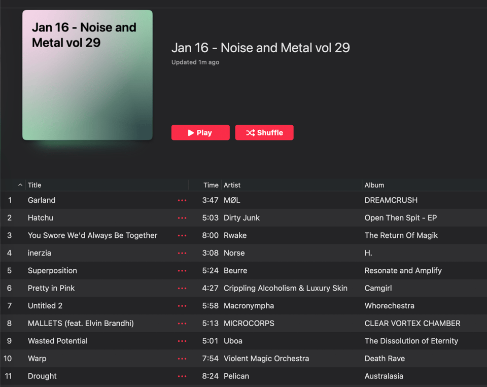 Got a noise and metal playlist for you today. It’s a good’un if you are a fan of these genres. And, I know, most of you are not. That’s okay. Bill and Nick are. Now we are three. Violent Magic Orchestra are coming to town in a few months. I am very excited. Thank you Bill for the Pelican recommendation. Thank you internet for the rest of these recommendations.