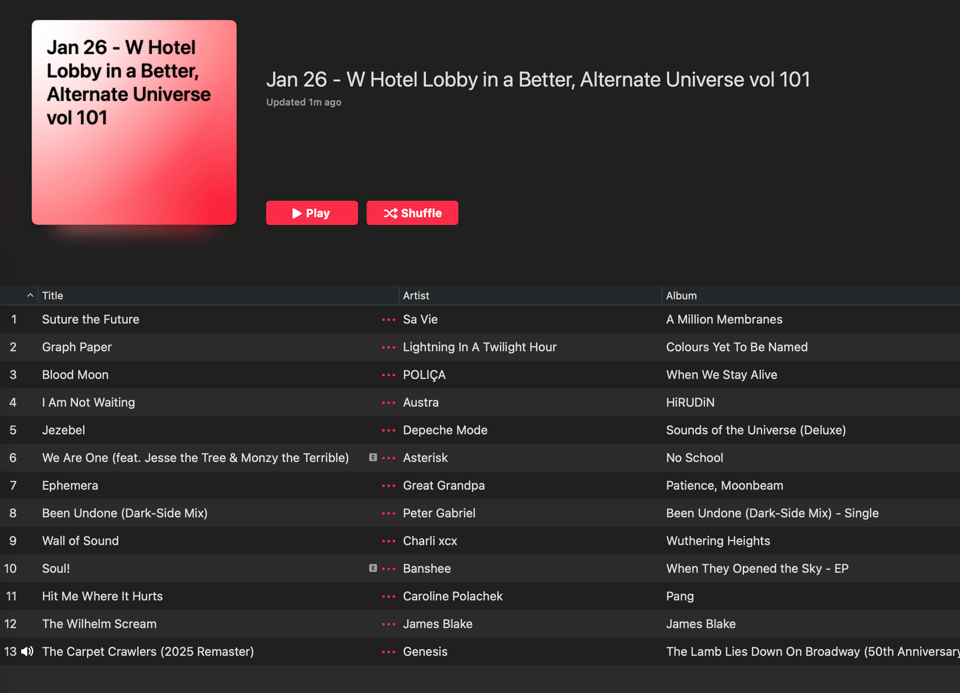 W Hotel Lobby in a Better, Alternate Universe playlist for you today. No one listens to these now that I switched to Apple Music, huh. Well. I mean, that tracks. No one reads this now that I left Facebook. I KID. You guys are the best. I love you all.