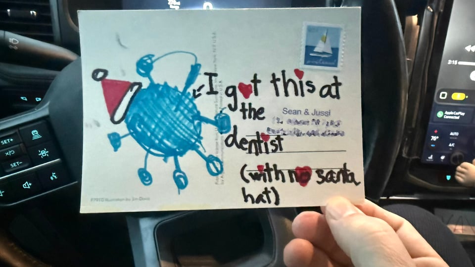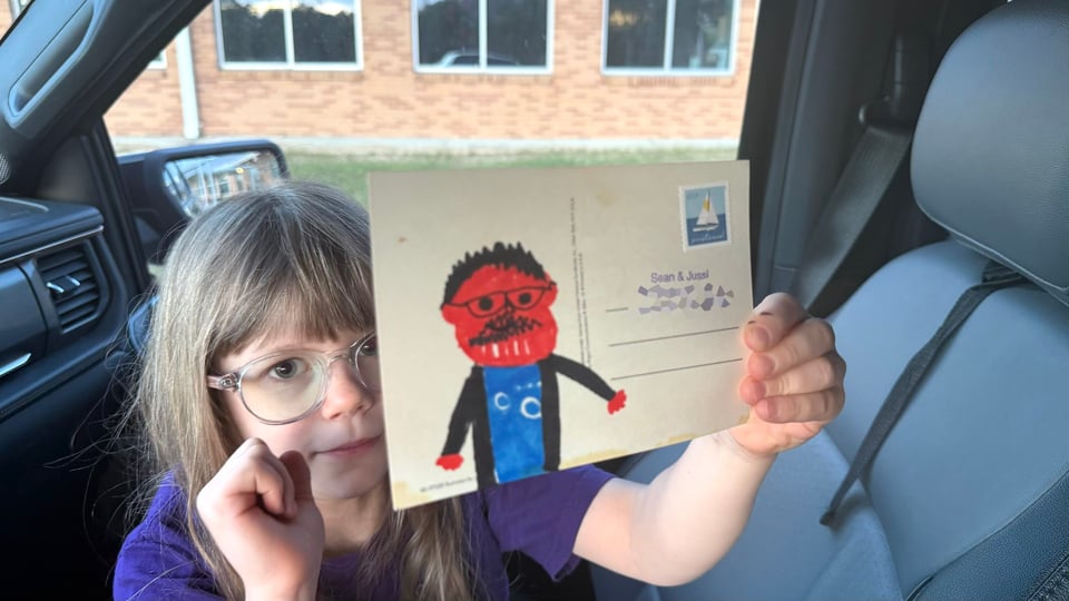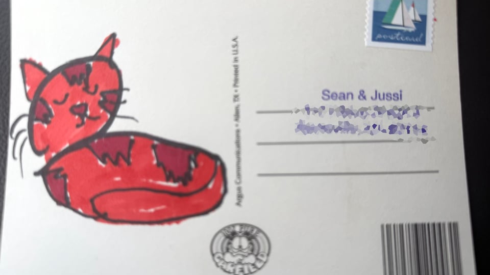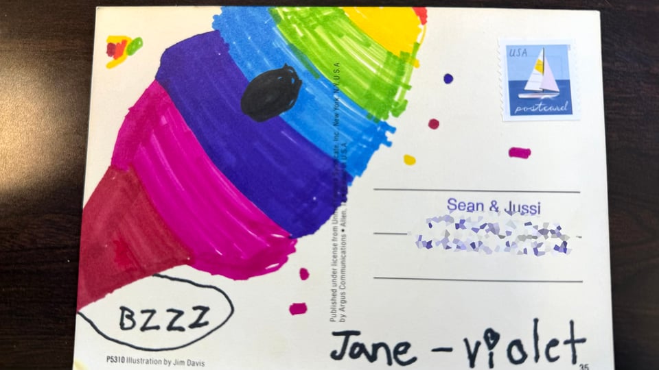 Jane would color them each morning in the car. We had a set of markers at the ready. On weekends she would draw on one while we were eating our breakfast. Each day I would drop one in the mail for Sean and Jussi. The plan was, originally, to never acknowledge it, but of course that fell by the wayside by, like, week 2.
