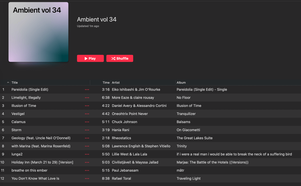 All right well I found a way to make the new playlist format a bit more legible, so there’s that at least. I am having an existential crisis over this whole “Apple Music doesn’t let you play playlists without an account and there are no free account” situation. Like, I could personally use SongShift every morning to make a link for this playlist on Spotify, but a) That’s a lot of work, b) There are lots of people who got off Spotify and are on, like, Tidal or Qbuzz or something, and c) that is the whole point, getting off of Spotify, and I don’t want to help people stay there. So, I dunno, man. Part of me wants to say “this is on you, just use SongShift to move the playlist where you want,” but that is a ton of work for everyone, I’m not even sure you can move a playlist away from Apple Music without an account, and they don’t even make SongShift for Android (though I’m sure there is some equivalent). The whole thing sucks. BUT, I am off Spotify, and I’m staying off. And if no one can listen to my playlists anymore, well, so be it. Shit I shoulda switched to Youtube. Maybe it’s not too late.