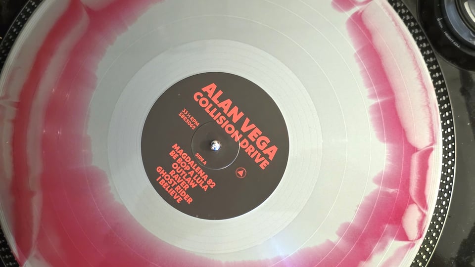 We are listening this morning to the first two Alan Vega solo records, recently re-released on Sacred Bones records, one of my favorite labels. They are far more rockabilly than I thought — which I guess actually makes sense, there always was a bit of a rockabilly sensibility going through Suicide. And now, actually, I am on Side B of his second record, Collision Drive, and thing are getting a bit more sludgy and droney. Looks like these records are three years after Suicide and five years before Ghost Riders.