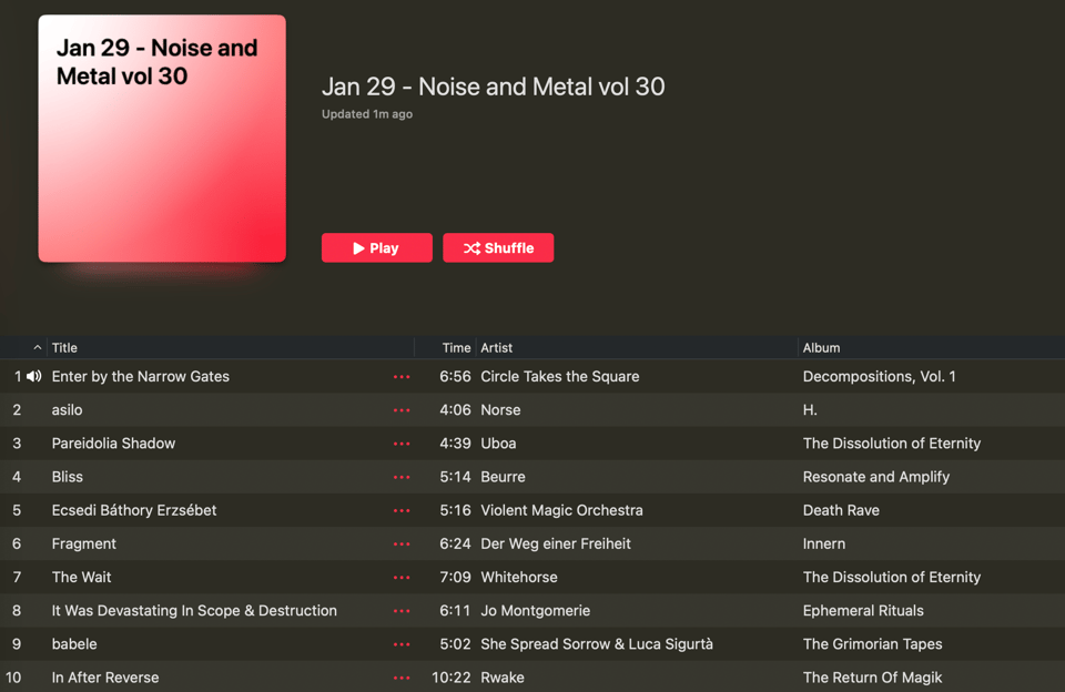 Noise and metal playlist today. Two bands from the Helen Scarsdale Agency. Other than that mostly new stuff. What can I say, man, dark times call for dark noise and dark metal. Every kid who joins a metal band is, broadly speaking, one more kid who joined a community and is not living in online isolation, prone to radicalization. In a lot of ways then, Metal is like the YMCA you could say.