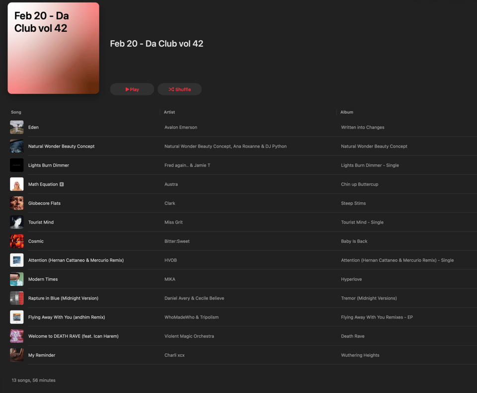 Club mix for you today. LIke I Said, VERY into this new Charlie XCX. Excited for the new Avalon Emerson. Mentioned this Natural Wonder Beautify Concept record the other day, and it turned out to be pretty different from Ana Roxanne solo but i still really liked it. Also love this new HVOB and Fred Again, of whom I am not normally a fan. But that one’s a banger.