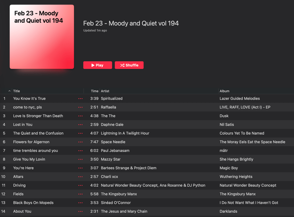 Moody and Quiet playlist today. It was about 2/3 done and I just filled it out with some (non) bangers. So now it’s about half new and old. Man I am obsessed with this Raffealla woman from New York I don’t know what it is, just keep listening to her. It is a thing. Oh and the Kingsbury Manx this is a whole thing a dude from that band owns a bar now next to one of our regular restaurant haunts, a BBQ place in Chapel Hill. We went there this weekend. Not the bar but the restaurant. I thought about going in and checking it out, but it seemed weird to go to a bar with my wife and kid and be like ‘hey is the owner here I like his band.” But that will probably eventually happen.