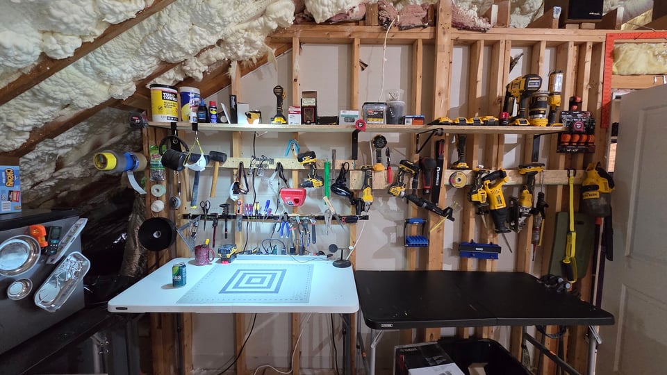 Also put the finishing touches on the workbench area, including a tape organizer, got my computer set up again so I can control the music and make lists and look at plans and whatnot.