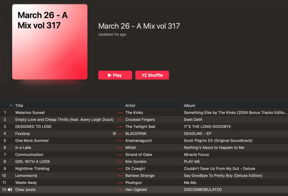 Oh look. Actually it looks like there is a Justa Mix that is almost done. I mean, sure, it’s mostly because of a 20-minute song, and I still need to add two, but that’s okay. Mostly new, plus “Waterloo Sunset,” of course, and a Plushgun song because Plushgun were rad and I miss them.