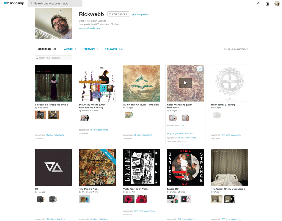 I just realized recently that your Bandcamp Collection page is a fascinating little insight into popularity. It tells you how many other people have each purchase in their collection. You can figure out what’s most popular in your collection and least popular. For me, the most popular is Cardinals at the Window, the Western North Carolina benefit album, with over 19,