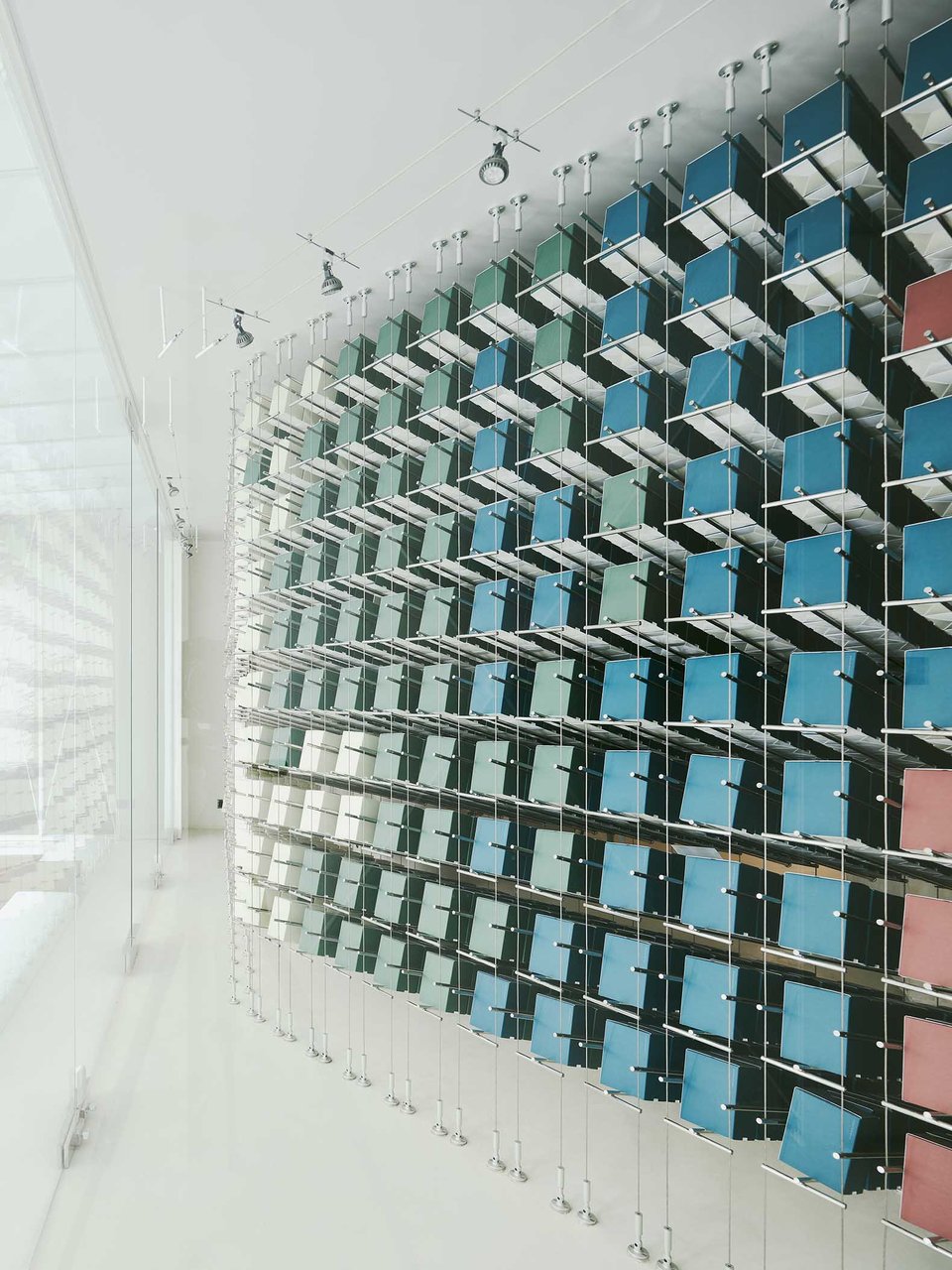 Waterfrom Design has unveiled "beanroom," an innovative coffee retail space in Taipei City that transforms its facade through customer interaction. The store features tilted shelves arranged in rows, where coffee packaging boxes act as dynamic folding screens between interior and exterior spaces. As customers purchase products and remove boxes, the remaining packages automatically slide forward, creating an ever-changing organic display that reflects daily consumption patterns. The design addresses the challenge of a partially obscured storefront while turning product packaging into an interactive architectural element.