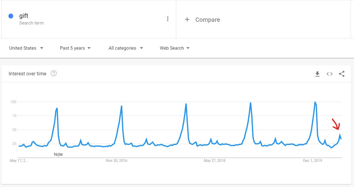 Some interesting #ecommerce Google trends data, as searches for [gifts] have spiked to all-time (non-Christmas) high: