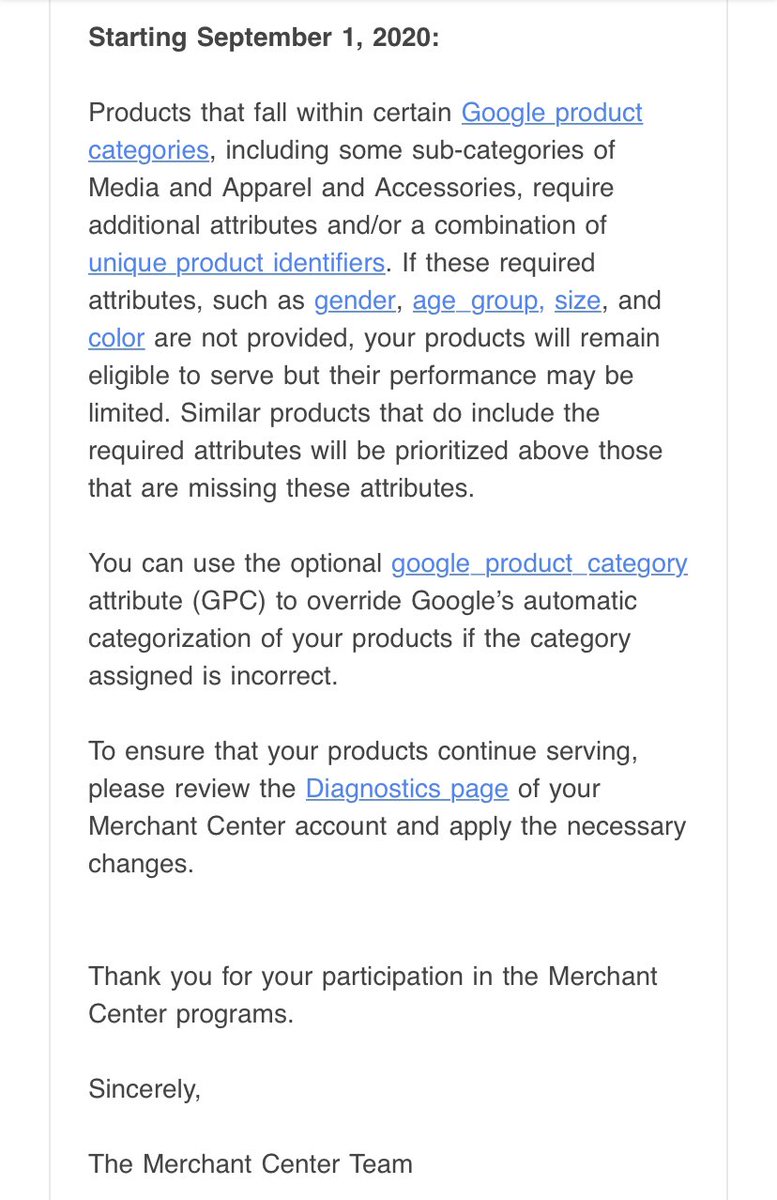 Heads up for Google Shopping. Get your data added in Merchant Center for age group, size, gender, and color or your competitors with that data in their feed could be prioritized above you in results. #ppcchat From email received tonight: