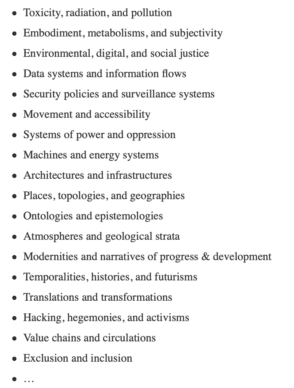 Refiguration of the Internet: This workshop explored different spatial changes and dynamics of Internet infrastructure using the notion of refiguration, which presents a concept of tensions between four key spatial figures and spatial logics: the place, the territory, the network, and the route. These tensions allow for the explanation of key conflicts in contemporary modernity. Related, this earlier event from Amsterdam: Those who control the Internet control the bounds of public speech, economic production, social cohesion, and politics, making its infrastructure a core political terrain in the networked age- enacted through material components such as cell antennas, clouds, chips, data servers, and satellites, but also less tangible, equally crucial standards and software components, including the operating systems, browsers, and computing power that enable connectivity.