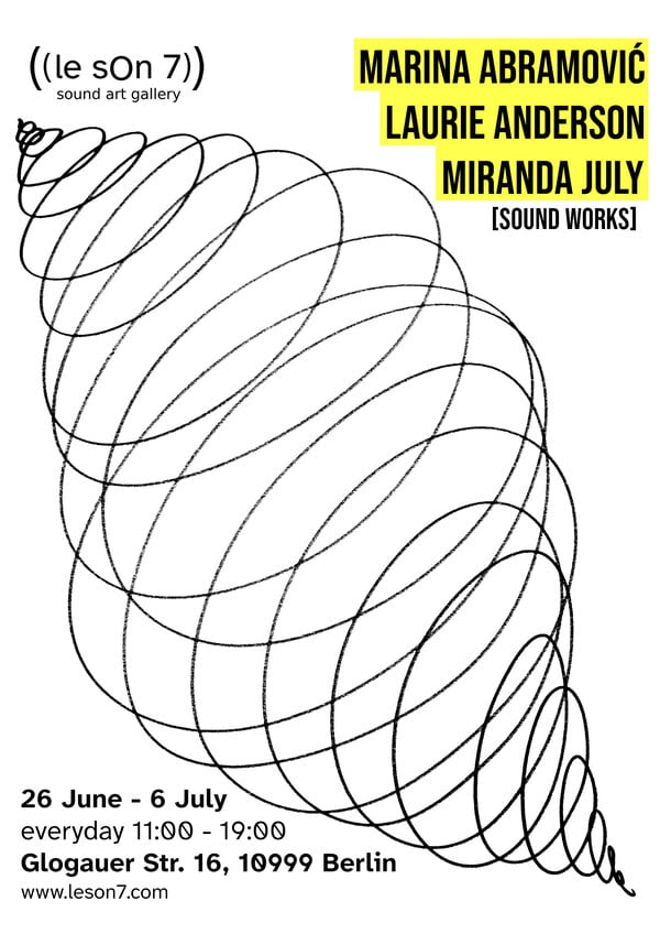 The heroines are coming to town (or at least their sirenic voices): The itinerant sound art gallery Le son 7 arrives in Berlin with audio works by three artists: Laurie Anderson, Marina Abramović and Miranda July. at Glogauer Str 16, 26 June–6 July, (free).