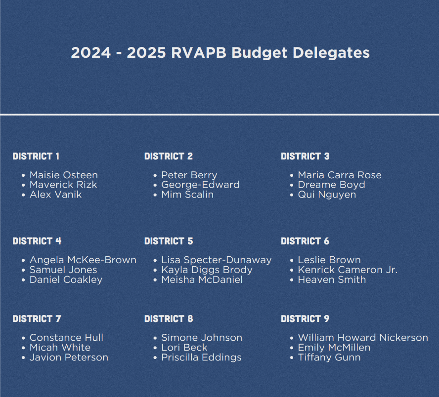 The Richmond People’s Budget extends a sincere thank you to our Delegates. Together we strive for a greater Richmond that is possible through the commitment to this vision. If any of these incredible folks are members of your family, friend group, neighborhood or (in true RVA fashion) running/biking group, please thank them for their awesome work and dedication to the City of Richmond!!