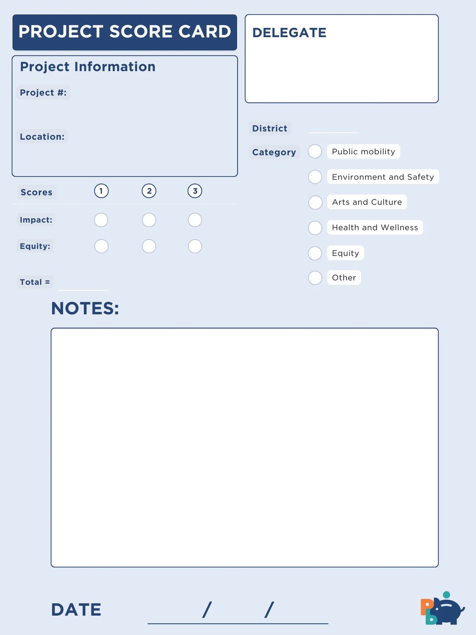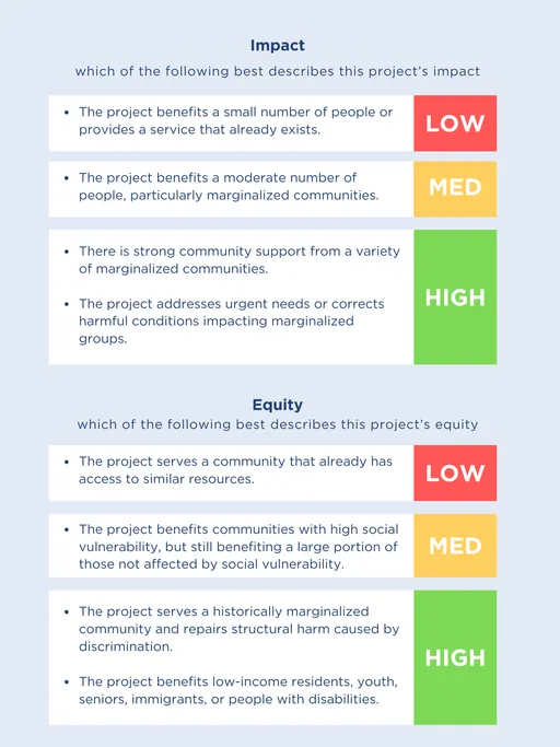Equity & Impact Rubric – Projects will be graded on Community Need, Project Impact, Equity, and Cost. This rubric helps evaluate who benefits, feasibility, and impact of each idea.