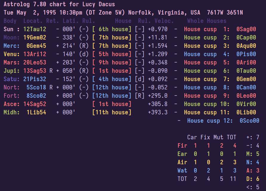 for the chart of the moment, which I very much deeply understand is important since I read Bruce Scofield's Astrological Chart Calculations and not truly secret if you have an ascendant and midheaven from which to reverse engineer, but you can imagine I, a Linux user, am a little weird about privacy.My goal in writing my own astrology CLI was basically to truncate the output of astrolog -n