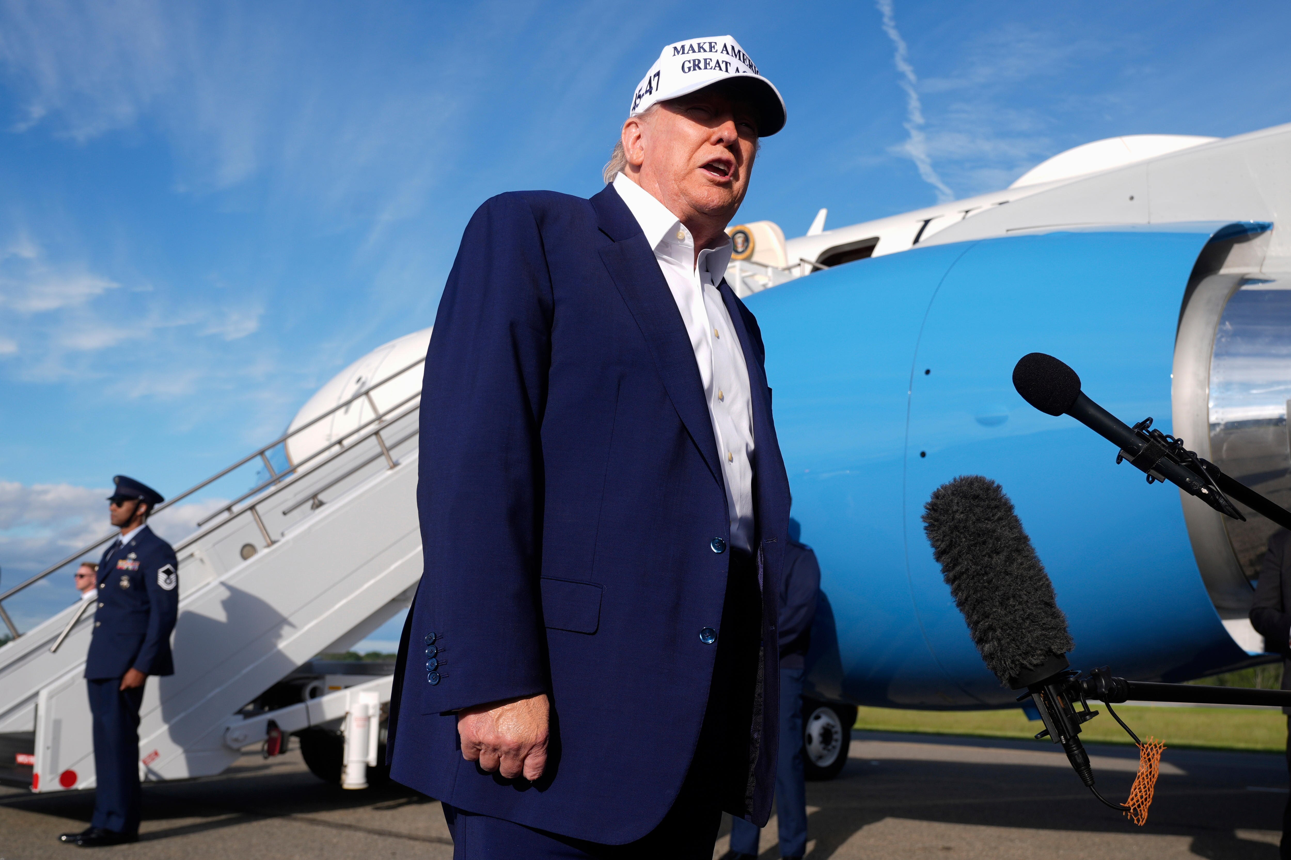 Description: President Trump on Sunday took questions from reporters in New Jersey before boarding Air Force One ...