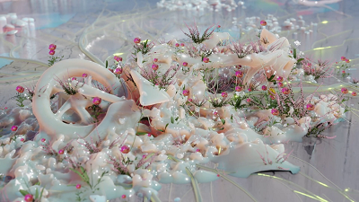 "Plane of Incidence I" (2024) - In an artist statement for the latest series of pieces by video artist Sabrina Ratté, she asks the question, "Are we flying through the perspective of mutated drones/bees, sounding like motors, and being attracted to the flowers growing on that strange, fleshy, breathing motorcycle?"
