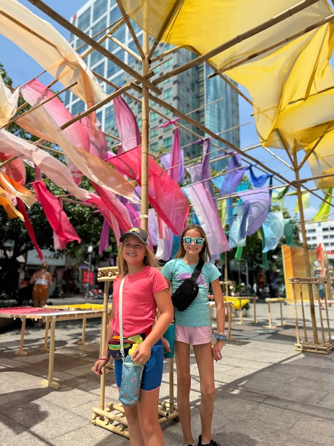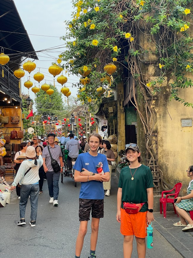 Thursday we said goodbye to Dad at the airport because he had to fly to Beijing for work. Mom, Abby and I flew to Da Nang with the Pauls. When we landed, we all got in a car and drove to Hoi An, where we had a nice lunch. After lunch we began exploring the Old Town. It contained another market, but also a smattering of museums. We got delicious Alluvia chocolate and ordered some pants from a local tailor for Mom. Then we got into town history with the Merchant House, a small museum that documented what happened during some of Vietnam’s most famous floods. It even had markers to show how high the floodwater rose. Once we were done with that, we went to watch a cultural dance and had lunch. Then came more wandering, picking up bananas and mangos for breakfast the next day, and bed.