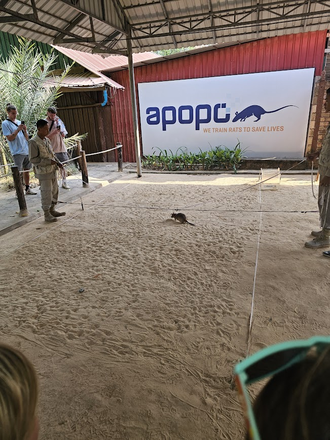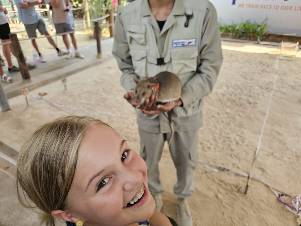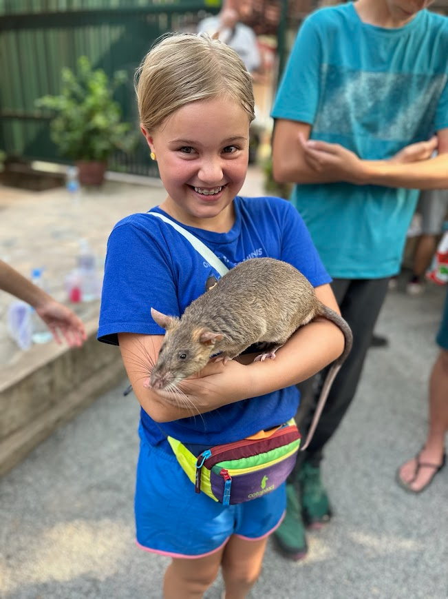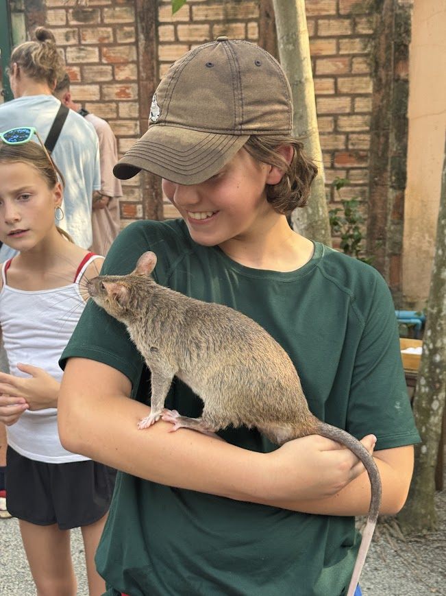 This week, we are excited to continue our travels with our friends Aurelia (10), Sabian (12), Aviva, and Chris. On Sunday, we all got the opportunity to visit the Apopo HeroRATs center. African giant pouched rats were given the nickname “HeroRATs” after being trained to sniff out landmines in Africa. Apopo eventually spread to places like Cambodia, where there are still unexploded landmines from the Vietnam War and the Khmer Rouge.