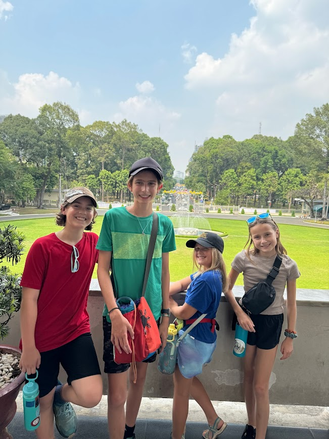 Wednesday started with a slow morning for Abby and me. After Mom dragged us out of bed, we wandered for a while and then got lunch bowls so we had energy for later. “Later” included a stop at a very fancy coffee shop where Dad and Chris each tried a cup. Next we all went to Independence Palace, which was an enticing blend of modern architecture and traditional Asian buildings. It even had an emergency bunker! After the palace, we walked to get dinner at a place that fried its chicken in a waterfall of oil. Dinner was fried chicken, banh mi, and gelato.