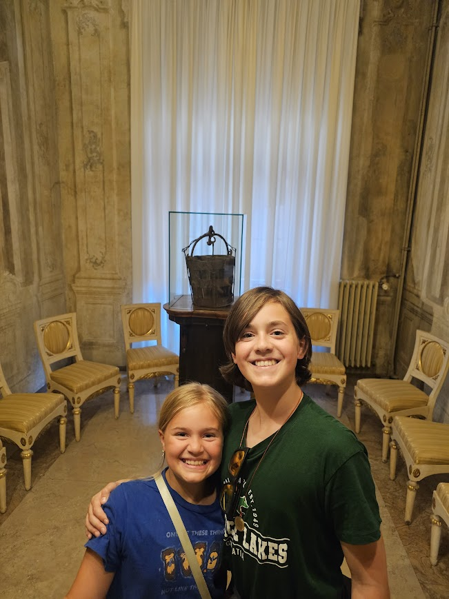 Ever since then, the bucket has been on display in Modena. It was first hung from the roof of their cathedral, and later moved to a local museum, where it is still on display to this day. We took a day trip to Modena to see this wonderful bucket because I already knew about its history, and when I learned that we could see it in person I jumped at the chance. It sits proudly on a pedestal in the middle of the room and is protected by a glass case, a red velvet barrier rope, and motion sensor alarms. It’s nothing special to look at, but it may be the most famous bucket in history. I loved learning about this crazy bit of medieval Italian history!