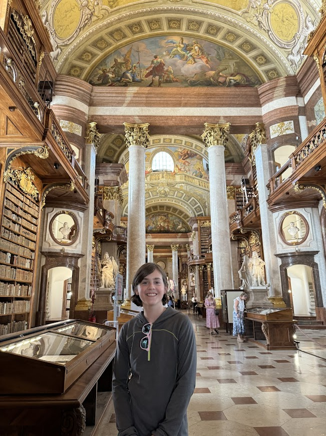 Afterwards, the kids and I ventured over to the Osterreichischen Nationalbibliothek, or Austrian National Library, located in a wing of the Hofburg Palace. There are a number of different wings of the library, but we visited the famed Prunksaal, or State Hall, which is renowned for its ornate architecture and artwork. This area isn’t a library in the traditional sense, where you can touch and check out books, but rather like a museum of historical books, sculptures, and artwork. It was a fascinating building!