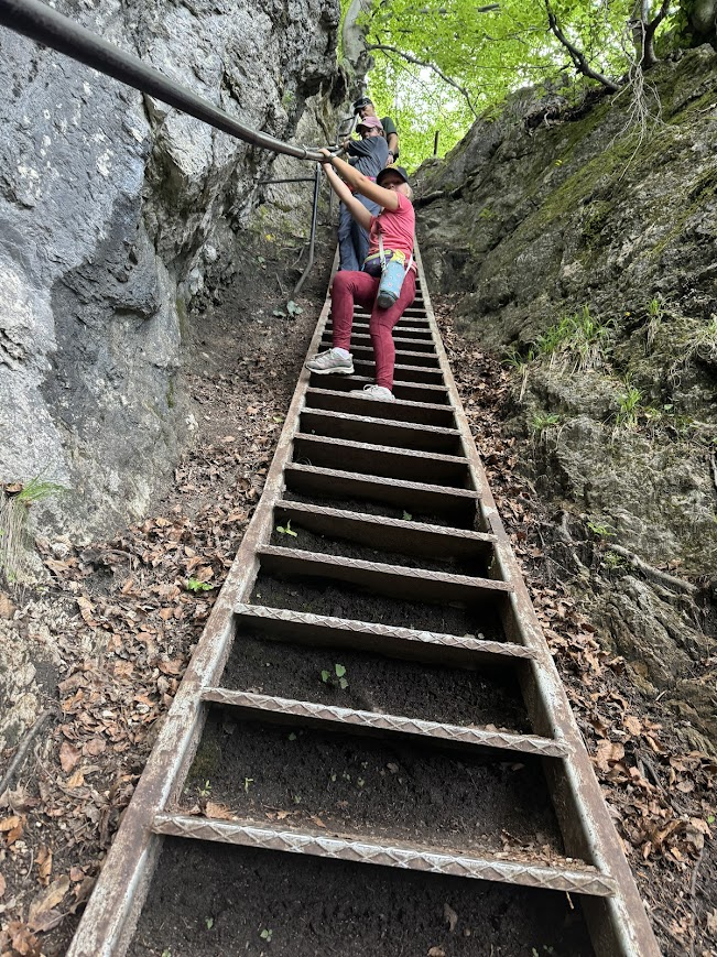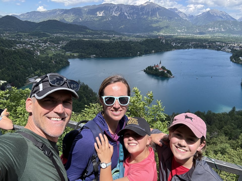 After cake, it was time for our main excursion – hiking! Bled is ringed by the enchanting Julian Alps, and while we didn’t have time for an especially long hike, we had been looking forward to a view of the town and lake from on high. We chose a short but steep trail up the side of the hills, and though we spend a lot of time walking these days it was nice for a change of pace that challenged us a bit more. Most of the walk was a dirt path, but near the top was a section of stairs so steep that James exclaimed, “Those aren’t stairs, that’s a ladder!” We nonetheless made it to the top of the trail, and were rewarded with a fantastic view.
