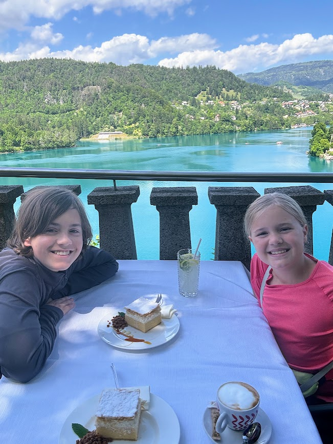 The drive wasn’t too long even with weekend traffic; it took us about an hour. When we got there, we had to find a parking spot. Our Airbnb host told us that we could park our car at a hotel if we had a snack at their cafe. This particular hotel used to belong to Tito, the leader of Yugoslavia when it was a country, and we weren’t opposed to the idea of having a snack in a place with such rich history! Also, at the cafe they serve kremna rezina, Bled’s traditional cake, which we wanted to try. The cake is layers of fried pastry under a thick chunk of cream custard under lots of whipped cream under more fried pastry, all under powdered sugar. The name literally translates to “cream cake.”