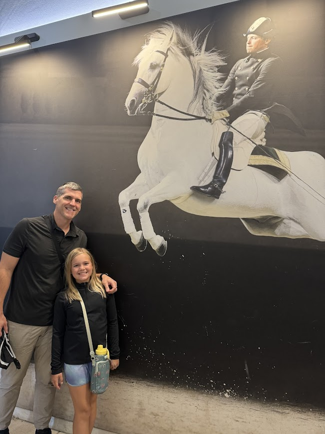 We were able to get standing-room-only tickets for a full show on Friday morning, and we were all excited. After going to the wrong floor (need to learn some more German!), we eventually found where to stand and luckily got a spot with a decent view. The moves the horses do are split into “on the ground” and “above the ground” schools. All of the horses that make it through the school can do the on the ground work, but not every horse can do above the ground. This is distinguished by the color of their blanket. The show was done in three parts, the first being one horse being led by the long rein. This is where the rider actually walks behind the horse holding long reins. I was awed by this, as the trust the rider must have in the horse to be standing right behind it was immense, and the two walked through a well choreographed performance together. Next was a set with five horses, four with riders walking alongside and one with the rider astride the horse. This had more action as the horses did some in the air work as well as various on the ground tricks. The show ended with four horses with riders on, with the four doing a lot of jumps and other tricks in the air. In all it was a truly amazing experience, as the horses were precise and the relationship between the horse and rider was apparent, with each trusting each other immensely. If you ever find yourself in Vienna, I would highly recommend you pay a visit to the Spanischen Hofreitschule and see a show.