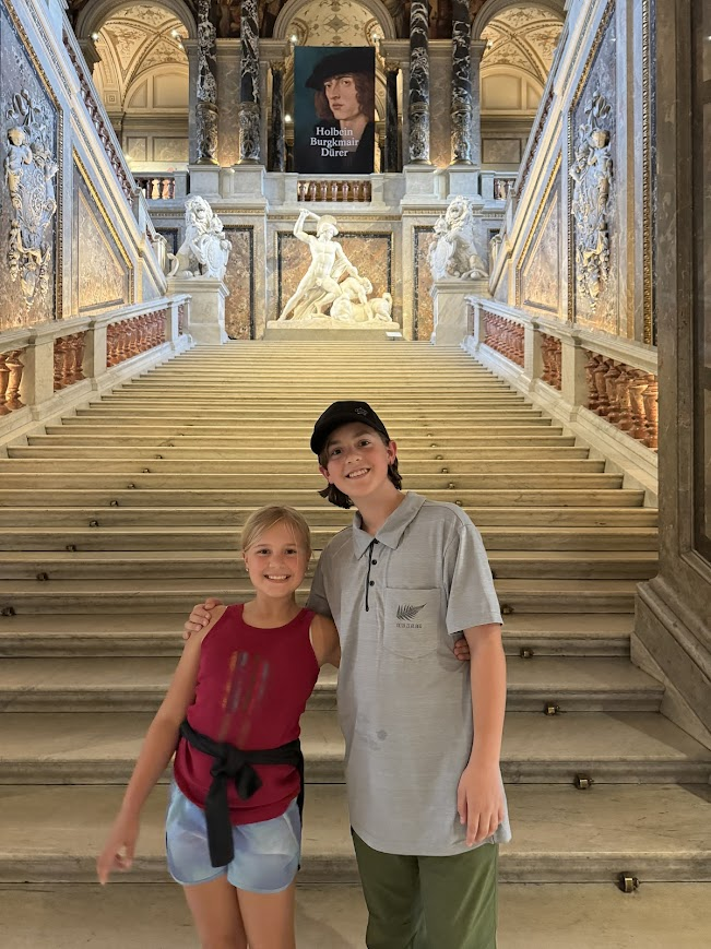 On Friday we started the day by seeing a performance at the Spanish Riding School. Seats can sell out months in advance, but we were able to get standing room tickets. It was an amazing show! I had described their type of exacting dressage to Sean and the kids as ballet for horses, and we weren’t disappointed: the show was great! Afterwards, we walked to Kaiserliche Schatzkammer, the Imperial Treasury, which was filled with fantastic treasures from over a thousand years of Imperial rule. Next we had lunch at a lovely cafe and made our way to the Kunsthistorisches Museum Wein (KHM), which is Vienna’s great art history museum. Their portrait gallery is especially well-known, and has work from artists like Rembrandt, Vermeer, Raphael, Dürer, and more. By the time we emerged into a light rain, the day was gone and we headed back to the hotel to pack. Even though we felt like our days in Vienna were full, there were still tons of things on our list that we hadn’t had time for! It’s an amazing city.