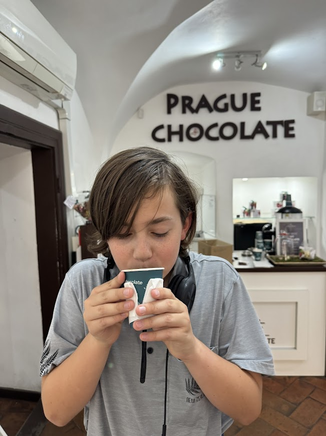 The next day we decided to finish off the walk as it was the Memorial day holiday (no work for me!). This brought us back to the Old Town square just in time to watch the famous astronomical clock tower go off. I’d recommend looking up a video, as it has too many features to try and capture them here. Let’s just say, it brings a crowd. The end of the audio tour brought us to Charles Bridge, named for Charles IV who ordered its construction in the 14th century. It spans the Vltava river, which runs through the city. Here we learned about Saint John of Nepomuk, whose statue shows the point he was hurled from the bridge by the king when Saint John would not divulge the secrets of the Queen. With the end of the audio tour, we decided to finish crossing the bridge and visit the castle grounds. On our way up towards the castle, we passed a store claiming the best hot chocolate in Prague. Due to James’ fondness for the beverage, we decided to give it a try. It turns out the store literally serves melted chocolate in a cup, and James decided their claim was sound.