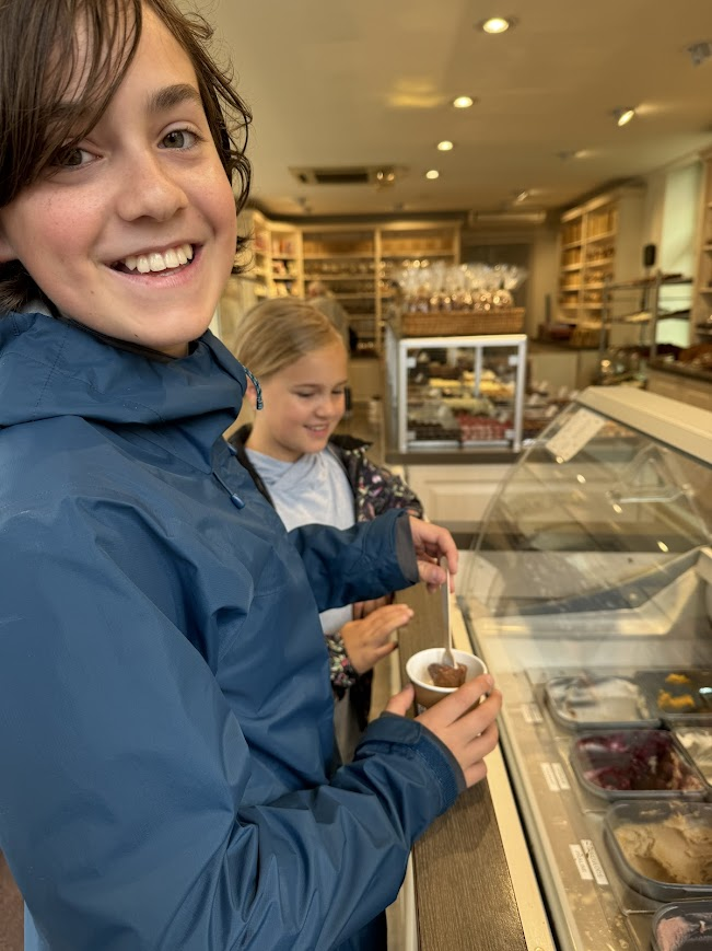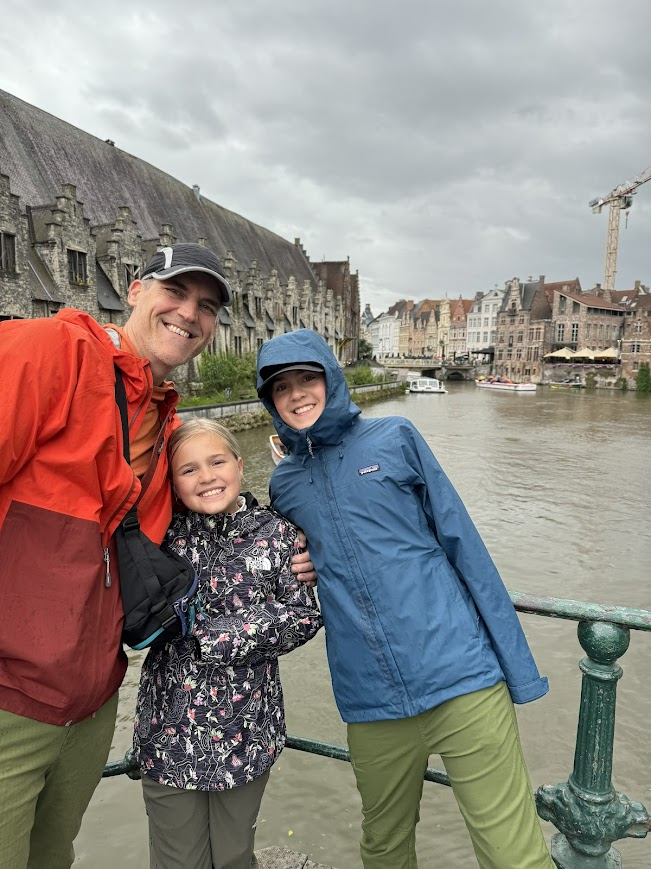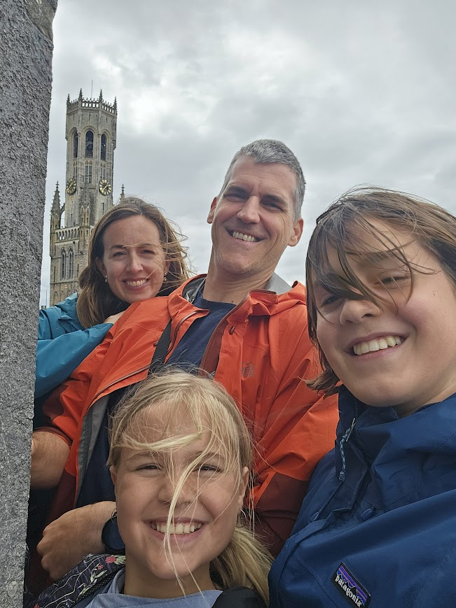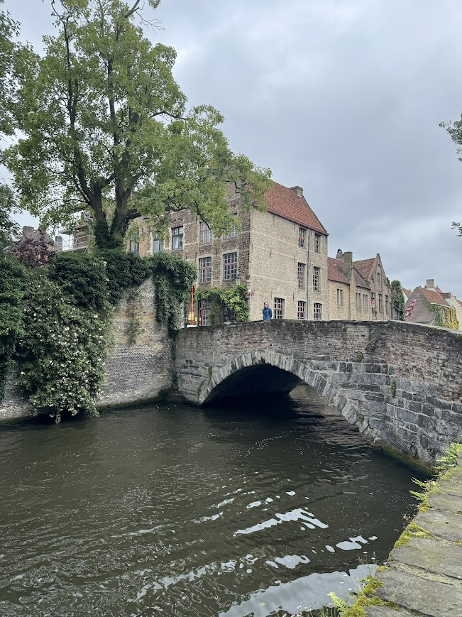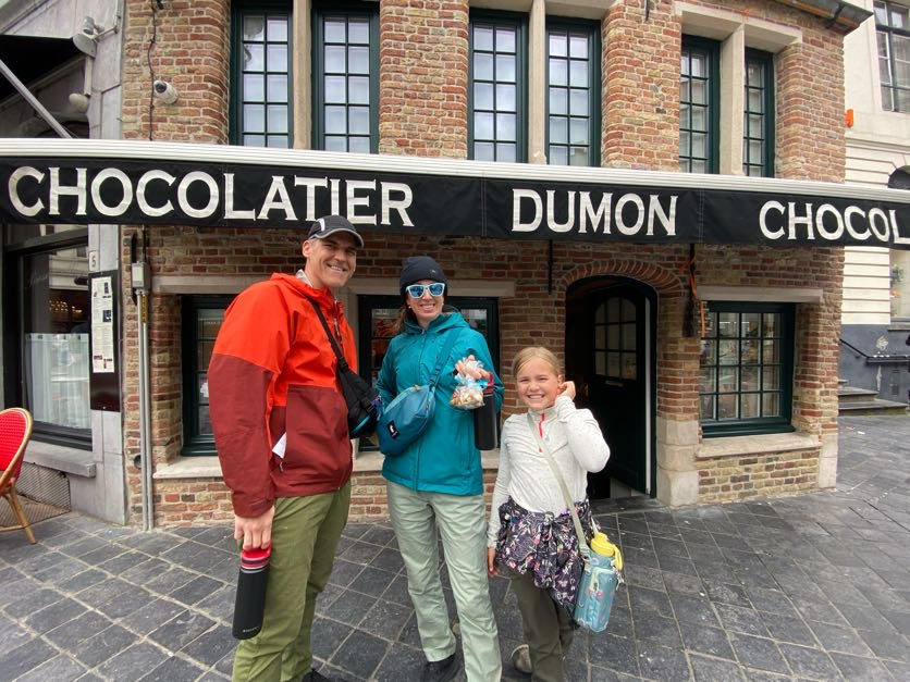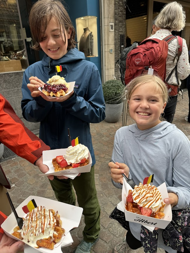 On Thursday we had to take two trains to Brugge, Belgium. It took a very long time thanks to delays in Brussels. By the time we got to our Airbnb and settled in, we only had time and energy for a late dinner and then it was off to bed. On Friday morning, we grabbed some delicious breakfast bagels for fuel before going off to a canal tour. It was very cold that day, so Abby and I got some hot chocolate, in the literal sense. We got it from a chocolate shop that made their hot cocoa by putting hot milk in a cup and giving you a cube of chocolate to melt into the liquid. It was wonderful. After our pretty ride, we met Dad to go to the Historium, a very interactive history museum. Its activities included a VR experience, an immersive movie-like tour, and a climb up a very tall tower for a breathtaking view of the town’s main square.Â