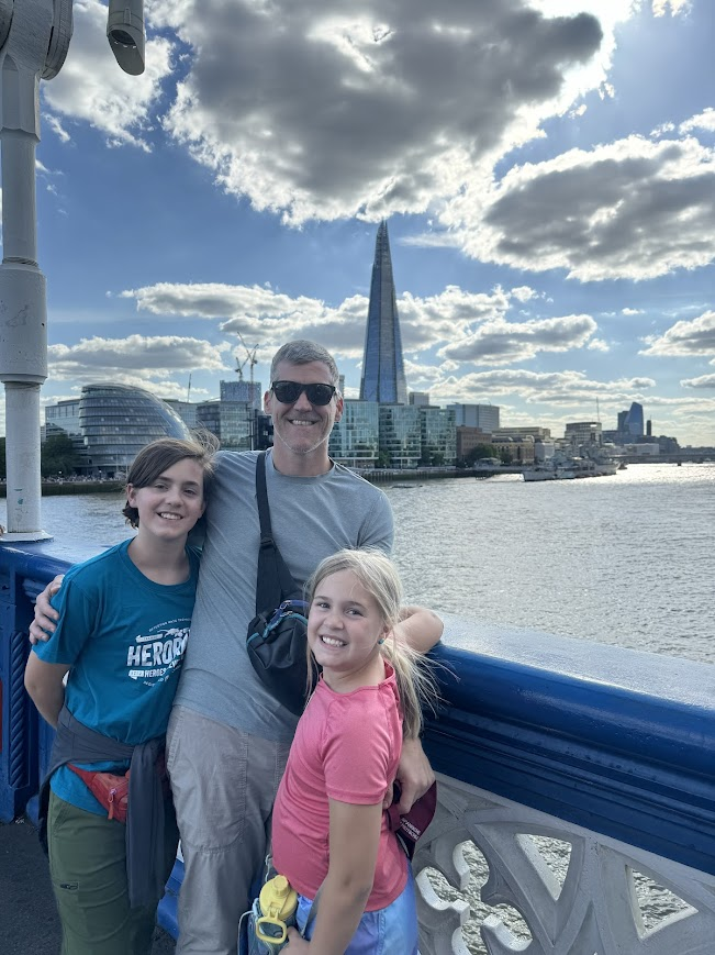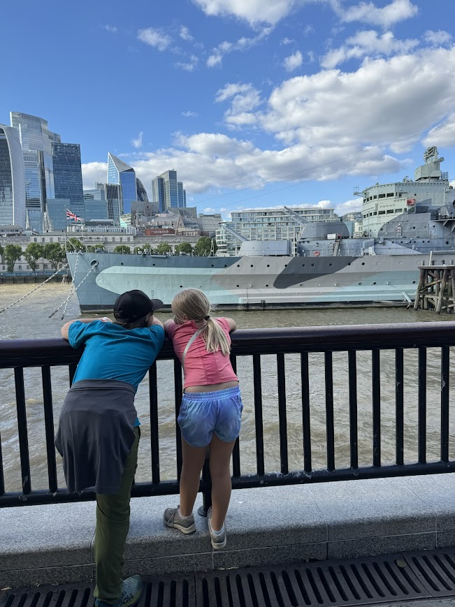 On Saturday our first stop was the Tower of London, and we were sure to make the Crown Jewels our priority, as it always has a long line to enter. No photos allowed, unfortunately, but the array of treasures belonging to the crown was beautiful! We had time to see the ravens, and explore the walls and some of the exhibits before heading out to our next visit: The Gunpowder Plot. This is a relatively new venue which is an immersive experience that lets you play a part in the Gunpowder Plot of November 1605. It uses an elaborate set, actors, and even some VR to create the experience, and it was definitely a fun way for the kids to learn about this bit of British History! By the time we emerged, we were ready for an early dinner at a traditional English pub. James wanted to walk across Tower Bridge before heading to the hotel, and the timing was perfect because we arrived in time to nearly front-row spots to view the bridge being raised for a ship. This happens several times a day, but it was fun to experience it up close. After crossing, we made our way along the river to admire the HMS Belfast, then took the Tube back to our hotel to pack up for our departure the next day. Time is going too fast!