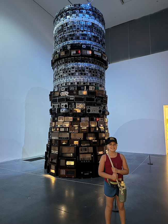 After our late night we slept in until 8:45, and slowly made our way down to breakfast. Sean didn’t have morning meetings, so we were able to go as a family to the Tate Modern. I had been wanting to return since our visit nine years ago to see the Rothko room, in which there are huge paintings in a twilight setting that invites visitors to sit, relax, and take in the artist’s work. Last time I visited, James was 4 and Abby was 1. By the time I found the correct room, Abby was just waking up from a nap in her stroller and I left the room shortly after arriving to avoid disturbing others. I was looking forward to visiting with older kids to appreciate the room fully, but unfortunately the paintings were on loan to a museum in Paris! I missed out on my main goal, but we all still enjoyed our visit to the museum. I especially like the Tate because the collection is noticeably more balanced than most museums in terms of gender and race, and they have made big efforts to increase their non-western art. Though it may not have been my favorite piece aesthetically speaking, the work that resonated most for me was Babel 2001, a take on the Tower of Babel for the technology era. The artist built a tower of analog radios from the 1920s onward, and tuned them to different frequencies. It was supposed to address the idea of “information overload and failed communication” that we now experience with our excessive exposure to technology. I stood in the room with all the dissonant voices and sounds. There was too much going on to process it all at once and I couldn’t help but think, “Yes! This is exactly what that feels like.” Too much, too fast. It was uncanny.