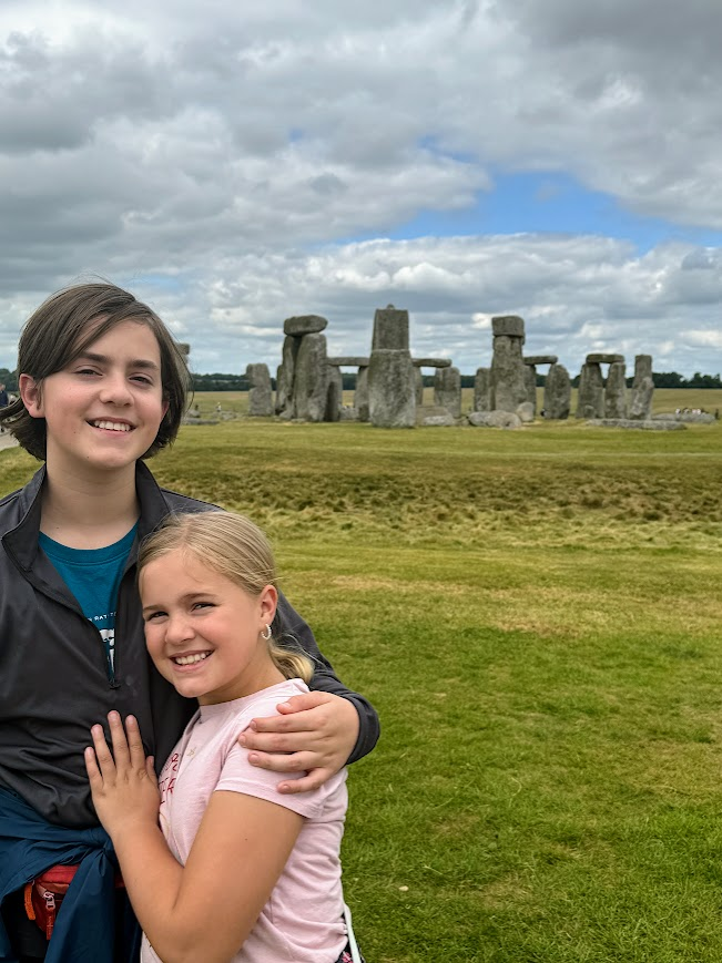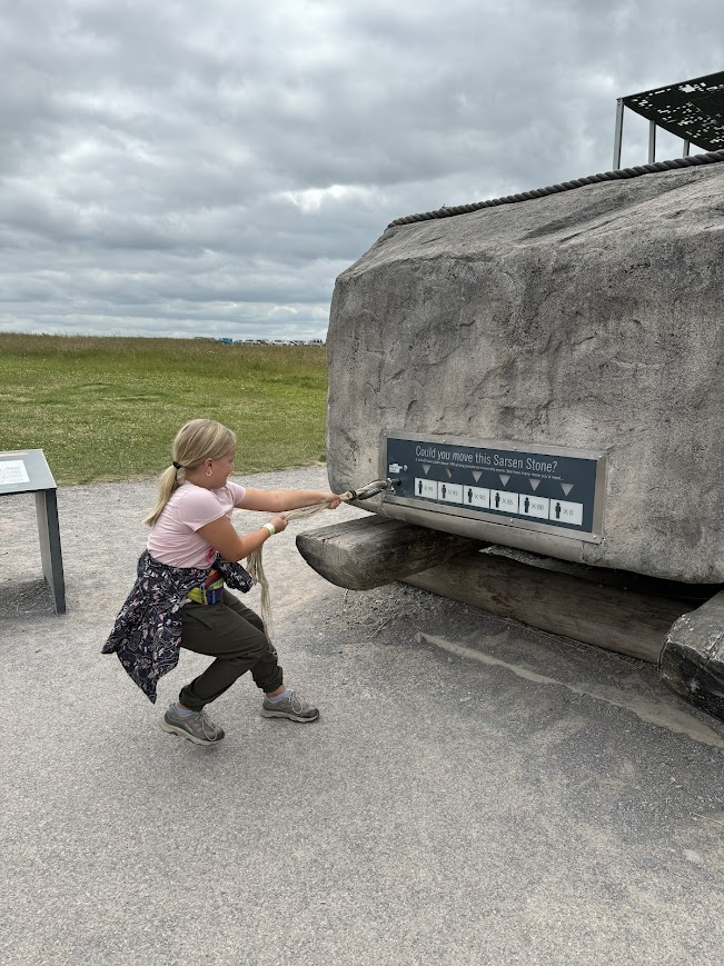Stonehenge, as everyone knows, is very old. In fact, it is even older than the pyramids of Egypt! The pyramids were actually built 500-1,000 years after Stonehenge was first constructed. The first version of Stonehenge was built 5,000 years ago, and was just a large ditch with maybe some wood posts or stones. Scientists think it was used as ceremonial grounds. 500 years later, big bulky stones called sarsens were carried from Wiltshire, England. Stones called bluestones, which were smaller but still big, were brought from 140 miles away in Wales. It must have been hard to transport all those stones! The average Stonehenge sarsen weighs over 30 tons. At the site, there was a challenge set up for people to pull on a sarsen stone and see how strong you were, which they measured by how many men you were worth. I wasn’t worth any men in strength (of course 🙄) but Dad equaled the strength of 5-10 men!