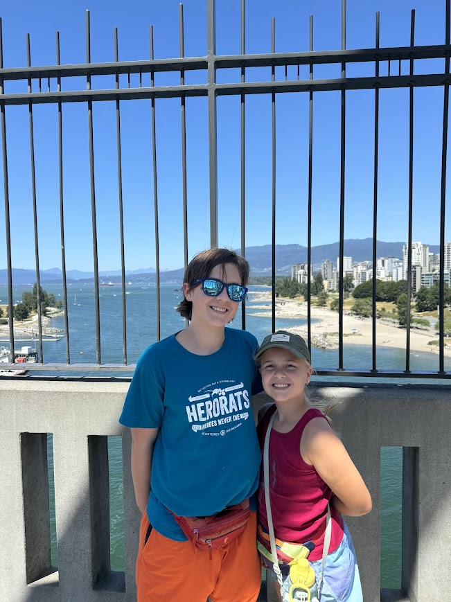 On Friday morning we said our sad goodbyes to Jan and Barry and boarded the plane to Vancouver. We checked into our hotel, then Dad stayed to do some work while the rest of us went out to explore the city, starting with lunch at a bakery, where we got sandwiches and donuts. Then we were able to wander the city, and we found a great playground! Abby and I had a lot of fun there while Mom watched. Then Mom found our next destination: the Vancouver Public Library. It had 9 floors of books of every type, size, and genre. There was even a rooftop garden where you could sit and enjoy your books. I could have spent all day there, but alas, we only had an hour before it closed for the day. Dad met us there and the four of us walked back to the hotel together through the city, with a brief stop for crème brûlée ice cream.