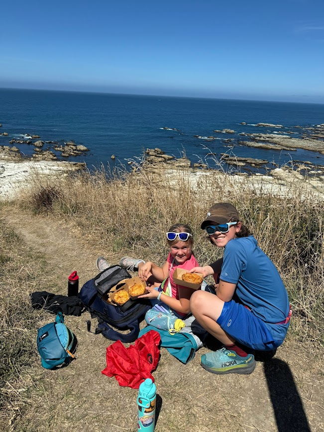 Early this week the kids and I picked up lunch and had a picnic lunch along a peninsula track in Kaikōura, and it was lovely! Sitting on the cliffs overlooking the ocean, eating meat pies… what could be better? Our only sadness was that Oreo can’t enjoy all the walks with us - he would love all the new smells! We are all missing him a lot.