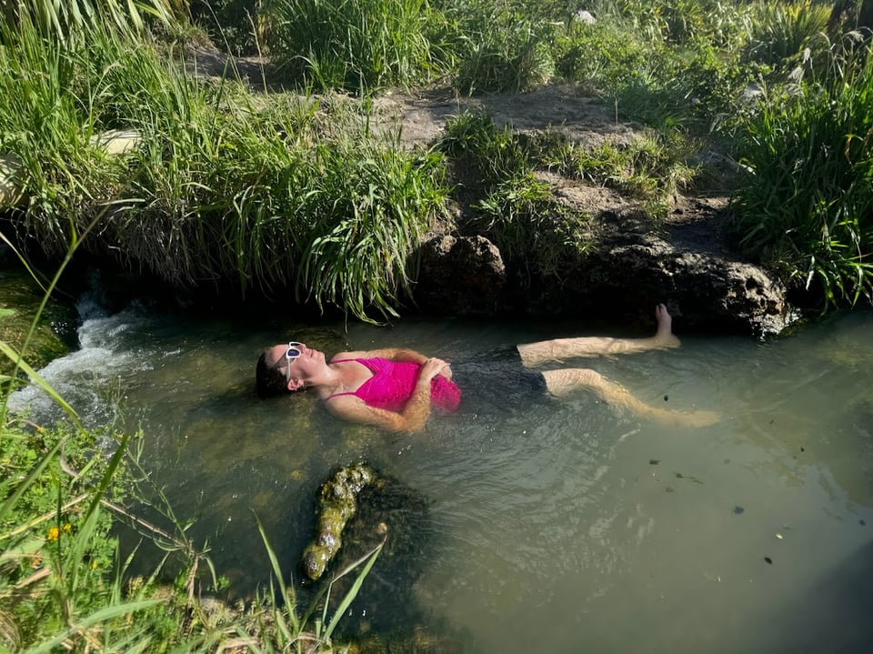 The walk to the falls is an hour each way and starts where the river is wide and smooth; it’s hard to imagine how turbulent it will become at the end! The stroll along the river is beautiful, but one of the best parts of the walk is right where it starts and ends. Spa Thermal Park is a little spot where you can soak in the thermally heated waters of the Otumuheke Stream as it flows into the Waikato. Thanks to the abundant geothermal activity in the area, the Otumuheke is naturally warm year-round. It’s one of many hot springs in the area, but this one was top on our list because it was a delightful way to relax after a nice walk! The stream creates pools of water and mini waterfalls to lay in as it makes its way down to the river, and you can choose your temperature; for warmer water go upstream, and for cooler water you can swim down where it joins the Waikato. I wouldn’t describe the water as hot, but it was pleasantly warm. At one point, I found myself soaking alone in a pool with my head on a rock, watching the clouds pass overhead and listening to the waterfalls around me. It was so peaceful. Not a bad way to end the day!