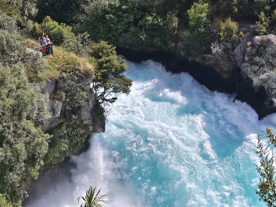 Midweek was when we transitioned from the South Island to the North Island, and one of our favorite walks this week was up north in Taupo. Taupo is most famous for it’s large lake, which is actually the caldera of a volcano that exploded many centuries ago and was so large that places like Beijing and Rome noticed gray skies! Taupo also has another famous water feature, which is Huka Falls. The falls are formed where the Waikato River (the longest in New Zealand) is compressed through a canyon, and the normal 100 meters of riverbed is suddenly squeezed down to 15 meters across. The enormous pressure makes for incredibly fast-moving water, and we found it mesmerizing to watch the churning white and turquoise foam.