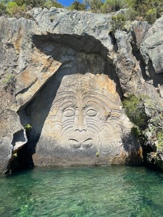 On Saturday we went on a cruise tour of Lake Taupo that brought us to some Maori rock carvings. These carvings can only be seen by water, and they are very big and very interesting.