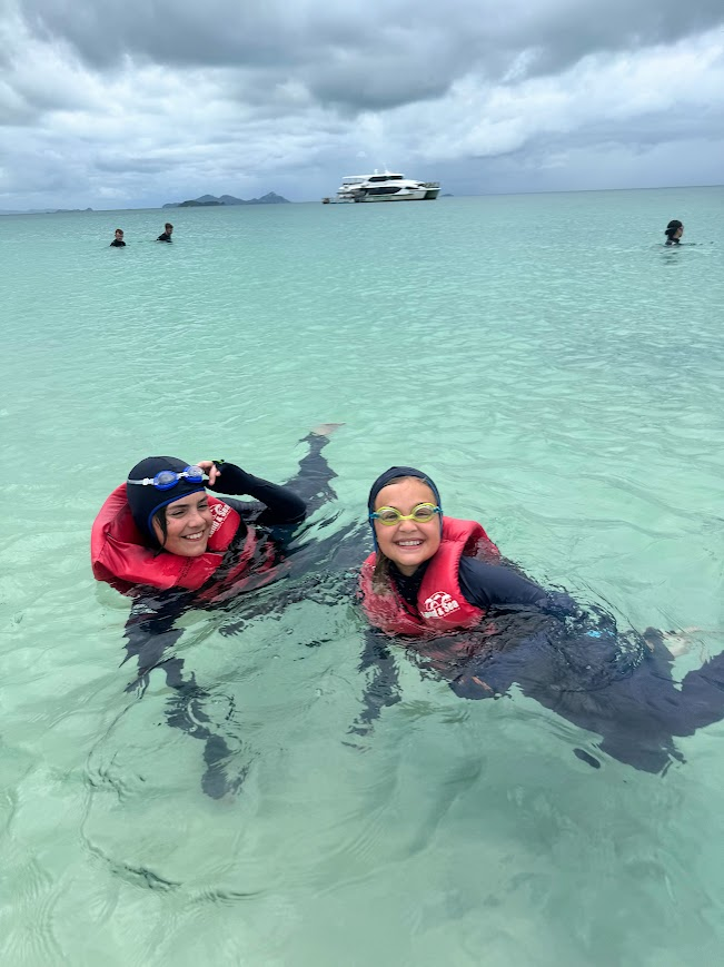 After the hike we took a dip in one of the bays on that side of the island before taking the boat back to Whitehaven. But what about the jellyfish? No worries, our cruise equipped us with stinger suits! If you’ve never seen one, it’s like a wetsuit, except thinner and less flattering. It’s basically a lycra bodysuit, complete with mittens, stirrup straps, and a hood. The only purpose is to cover as much of your body as possible, and that it does well. The fact that you look a treat in addition to being safe is a fun bonus… but I’d rather look bad than feel bad, so on went the stinger suits.