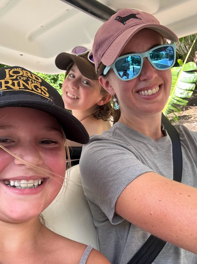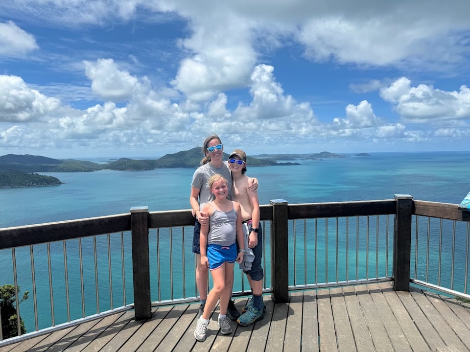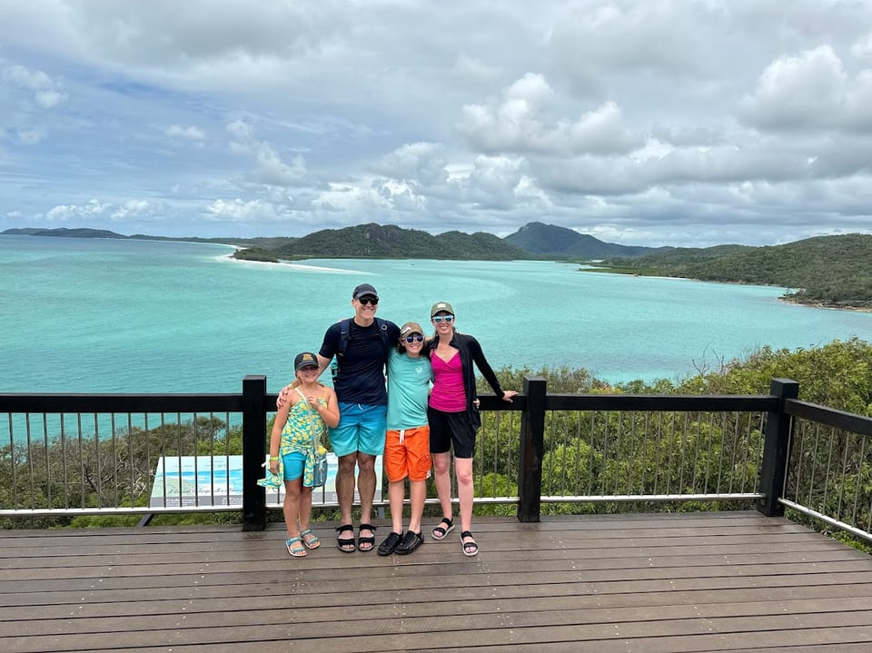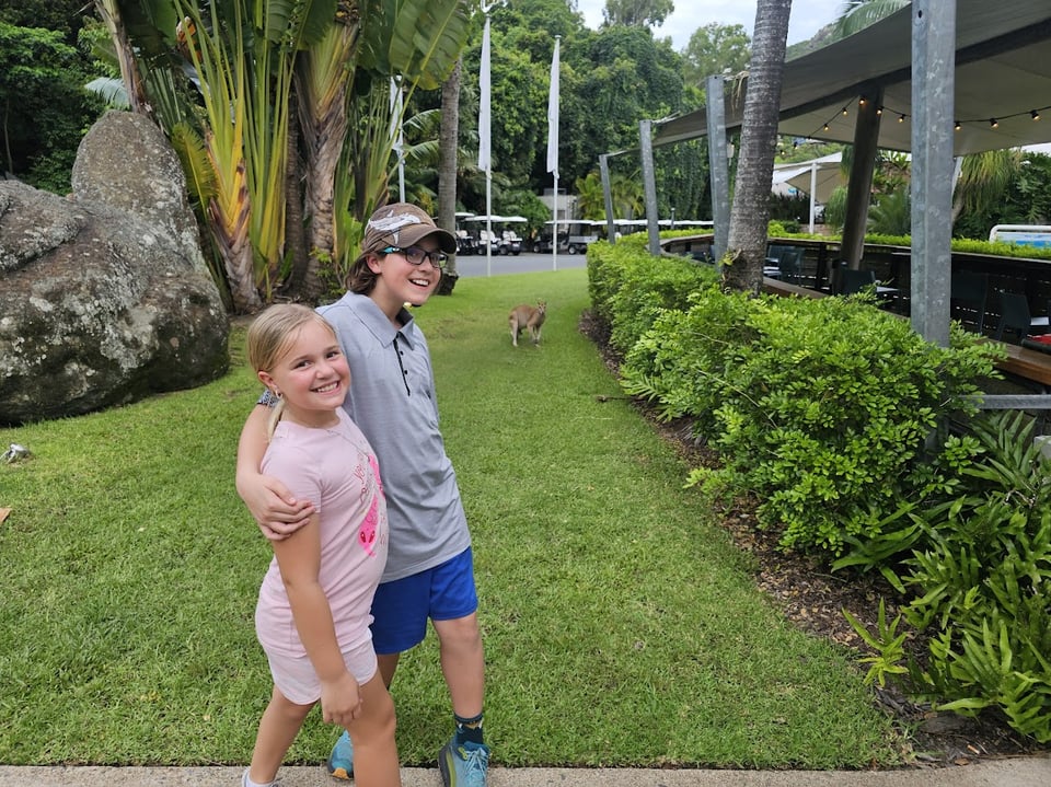 Sean works during weekdays, so the kids and I spend that time exploring wherever we are. There are no private cars allowed on Hamilton Island, and James and Abby have been thrilled that our current mode of transportation is a golf cart/buggy. On our first day here we cruised around the island in our buggy, stopping at shops, an art gallery, and a wildlife center, before heading to one of the free pools on the island. There are a few beautiful beaches, but summer here is Stinger Season and we’re not wild about risking getting stung by Irukandji jellyfish, so we stuck to the pools and admired the beach from the sandy edges. The next day we did a hike to Passage Peak, the highest point on Hamilton Island. It was a hot walk to the top, but we were rewarded with cool breezes and a 365-degree view of the Whitsundays from the summit!