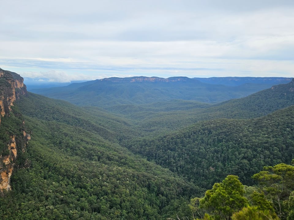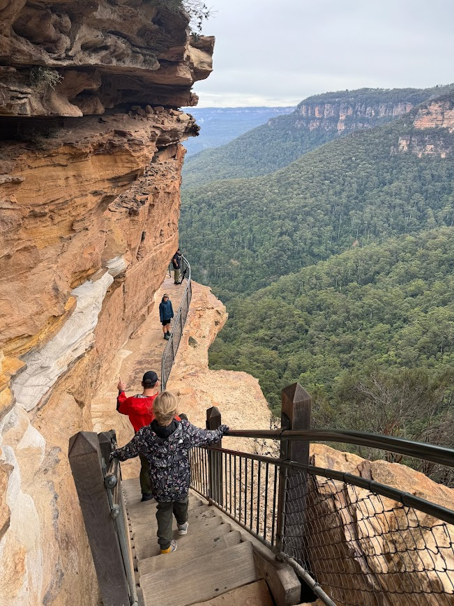 After doing some walks near Echo Point, we stopped at a bakery to eat some pies (pumpkin, lentil, and feta was surprisingly delicious) before continuing to Wentworth Falls. Here we started a rainy walk to the falls, and just a taste of the National Pass that continues down the cliffs and along the river at the valley floor. The walk was incredible, thinking about how the early workers had to hang off the side to carve the steps, and going from rainforest to sudden cliff side views into the distance. Returning, we took a slightly different path along the Undercliff track and the Princes Rock lookout track, which gave us excellent views of the falls as the rain cleared out and clouds rolled away.