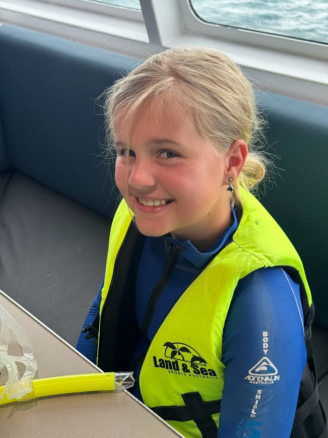 As we were stopping, everybody had to get in their gear, like finding the right size snorkels, flippers, and stinger suits. 🪼 Afterwards, we quickly had to squeeze me into a lifejacket and get our pool noodles (for extra buoyancy), then everybody made their way into the water.