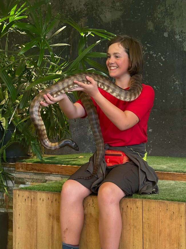 On Monday we decided to jazz things up with animal encounters. Abby and Dad got to pet a very fluffy koala named Yindi. I love snakes and I have always wanted to hold one, so when Mom saw that reptiles were an option for the encounters the two of us went for it immediately. The snake in question was a black-headed python (creatively named BHP) and we actually got to hold it! It was really interesting; smooth and dry, and you could feel all of the different muscles moving as it was bending around to look at you from every direction. It was also adorable - can you believe we were the only two people who wanted to hold the snake that day? We had lunch afterwards and went swimming to let out energy before bed.